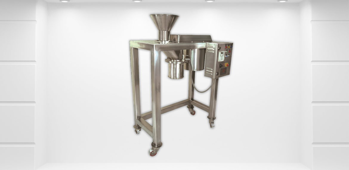 Unprocessed material is loaded into the product inlet of the Cone Mill by hand, gravity-feed or vacuum transfer. The material then passes into the milling chamber where a rotating impeller forces the unprocessed material through stationery cone-shaped screen by a vortex action.
